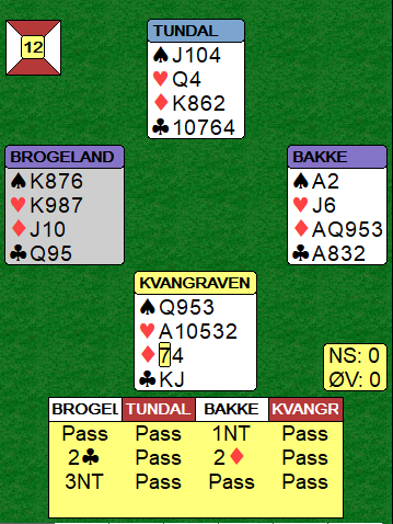Her var ruter ut fryktelig for forsvaret, spesielt da nord brukte kongen som kostet stikket hans i den fargen (å legge kongen kan være riktig om ruteren ser ganske annerledes ut ). Bakke stakk nords ruter konge og spilte liten kløver. Syd tok for kongen og spilte mer ruter til vests tier. Da fulgte en frekk liten hjerter fra vest, og nord la liten slik at knekten dro esset. Spillet var fullstendig ødelagt for N/S, og Bakke endte med 11 stikk!