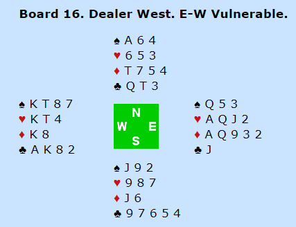 Min lagkamerat fant altså den vinnende meldingen, men dessverre kludret han det til i spilleføringen og gikk bet, -100. Ved det andre bordet spilte vi 3 ruter med +110, uavgjort spill.