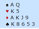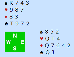 Merk at det er en safevariant i trumf her, hvis trumfen sitter litt annerledes i mot. Det bør spilles liten til knekten hvis øst følger med spar 10 i første runde. Her kommer kongen på og det er ingen problemer, men hvis øst hadde fulgt på med tieren er riktig spill å legge knekten. Om vest kan stikke den sitter fargen 2-1, ingen problemer, og ekstrasjansen spillefører får med seg er at øst har K-Q-10, altså alle trumfene på den siden. Har han det hjelper det ikke motspilleren å legge i en stor trumf i fargens første, tvert om, det hjelper spillefører som kanskje kan overse safevarianten om øst følger med tieren. Sånn som det satt var det ingen problemer i spillet, tolv enkle stikk, men det var problemer i meldingene.