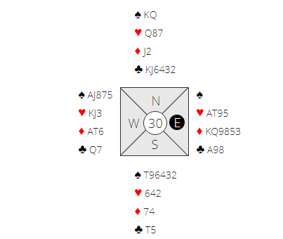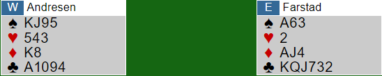 Flere steder ble det delkontrakt i kløver, normalt spilt av nord. Der er det ti stikk med riktig motspill. Hjerter ut bør føre til at øst får seg en hjerterstjeling, men så er det slutt. Spillefører får etter hvert godspilt ruter konge som gir ett avkast for spar, og syds fjerde hjerter gir parkering for nok en spar fra nords hånd, +130 til N/S.