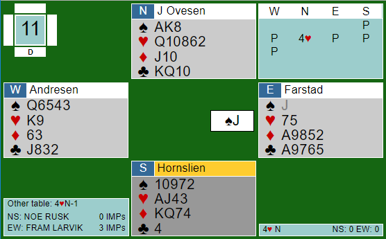 Noen steder fant ikke Ø/V stjelingen. Enten kom det annet utspill, eller vest returnerte ikke hjerter, og heller ikke spar som også holder kontrakten på ti stikk. Med for eksempel hjerter ut til esset og ruterskift fra vest i andre stikk blir det elleve stikk. De som noterte seg for +150 vant spillet 2-0 hvis N/S ved det andre bordet hadde +130, altså like stor BAM-gevinst som for de som var i utgang og vant den mot delkontrakt ved det andre bordet.