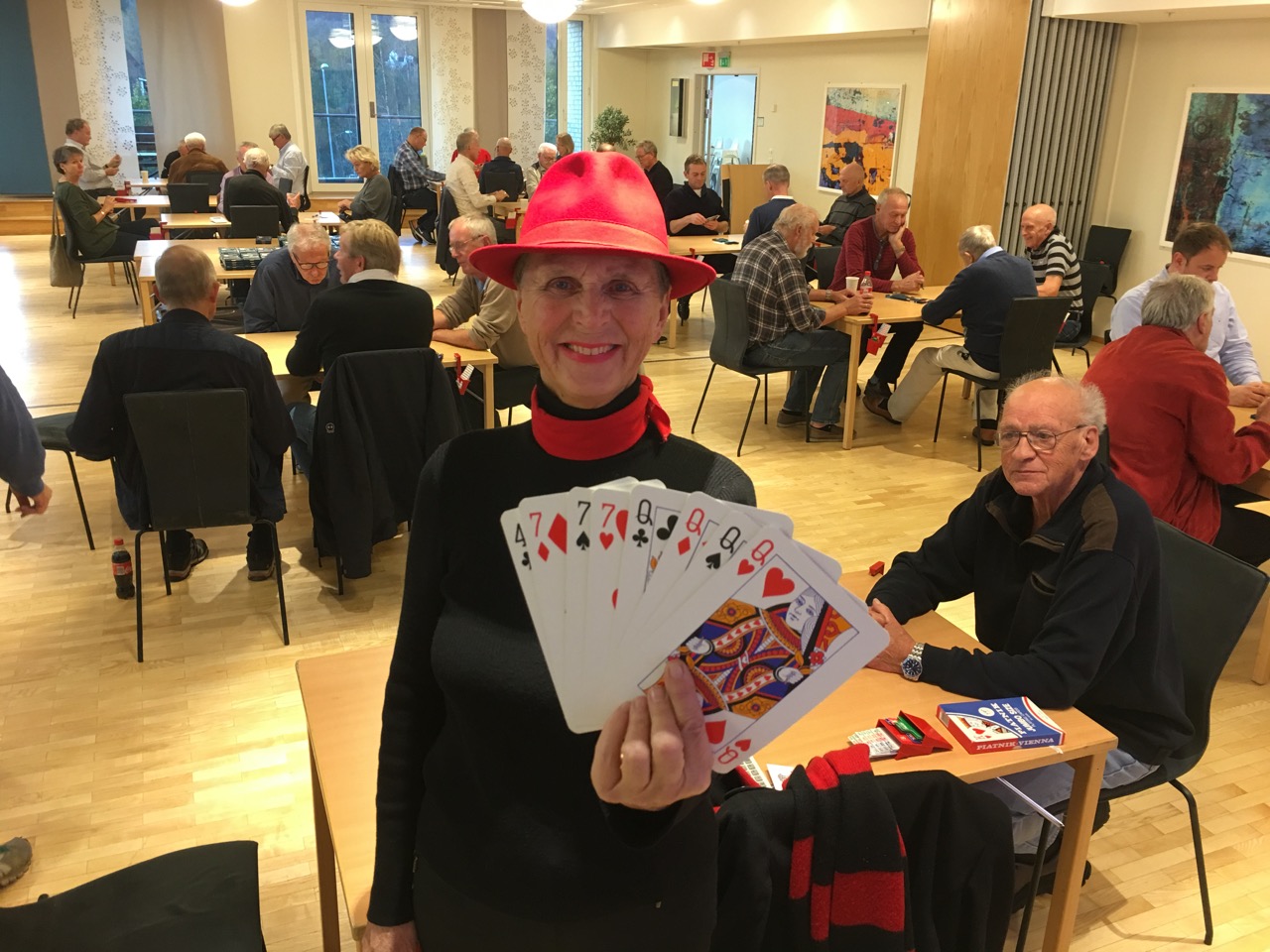 Ved det andre bordet åpnet øst i 3.hånd med 1 hjerter. Agnethe Hansen Kjensli (syd) sa 4 kløver og vest 4 hjerter før Sofie Græsholt Stjødal sa 5 kløver som ble doblet. Også i den kontrakten handler det om fargekombinasjoner, fiske eller toppe.