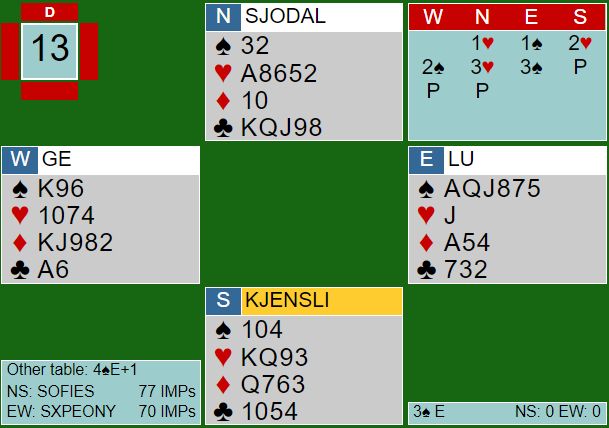 Ida Marie Øberg-Thea Lucia Indrebø hadde ingen problemer, og avtalene deres passet godt her. Over nords 1 hjerter hoppet Thea (øst) innpå med 2 spar som i deres system viser omtrent åpning med sekskorts farge i sonen (10-14). Syd støttet hjerteren, og Ida (vest) meldte enkelt og greit 4 spar. Thea hadde ingen problemer med å vinne den. Det ble elleve stikk, NORGE +650.