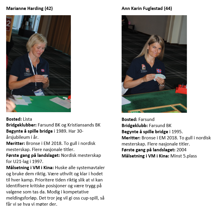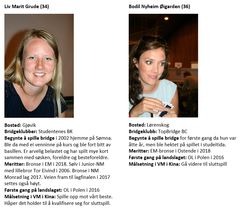 Tom Gyllensten (N) valgte å kravåpne med 2 kløver selv om honørstyrken bare var 15 HP. Fordelingen og spillestyrken var jo formidabel, minst utgang på egen hånd skulle man anta. Makker Anne- Kari Svendsen (S) svarte da 2 grand, jevn positiv hånd med ca 8+ hp. Nå viste Tom sparfarge, 5+ med 3 spar , Anne-Kari gjentok grand og Tom meldte 4 hjerter og med støtte der var veien til 6 hjerter klar. Kl 9 ut, 10-eren fra bordet og damen fra Vest med stjeling. På sp A kom 10-eren på fra Vest, illevarslende nok for her var det skjevsits så det holdt. Tom spilte så ruter til esset og dro hj J som fikk løpe. Ny spar kunne ikke Tone Annette tjene noe på å stjele så kongen vant. Sp 8 fanget min dame, brukte jeg den var jo fargen god. Dermed kunne jo Vest få stikk ved ¨å stjele, men da ville jo trumf konge kunne felles etterpå og siste trumf i bordet sikret godspilling av sparfargen. Ø-V hadde: