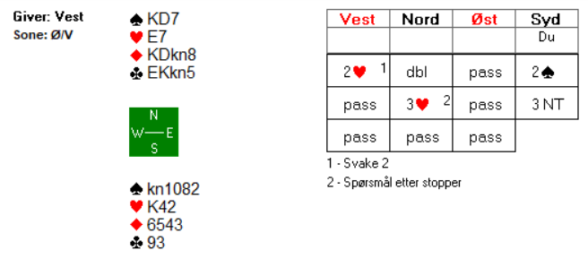 Vest har nok ikke begge essene fordi hun da ville åpnet på 1-trinnet siden hun allerede er markert med dame-knekt i hjerter.