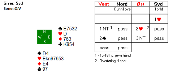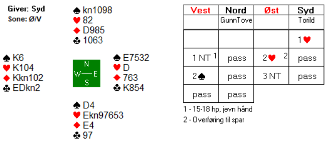 Syd spilte nå spar fra blindemann. Gunn Tove stakk og fridde seg i hjerter. Inne i bordet tok spillefører for ess-konge i kløver, før ruter knekt fulgte. Nå måtte Torild være våken og kaste ruter 9! Hvis ikke ville hun bli innspilt på den i neste stikk. Med bare hjerter igjen måtte hun så latt spillefører komme inn på hånda og hente ett stikk i hver av majorfargene for hjemgang i kontrakten.