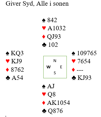 Ruterstikkene ble tatt med dsamme, og øst kom tidlig i trøbbel. Det er ikke lett for han, men han syndet for så vidt mot en viktig regel da han etter hvert ga opp en hjerter ved å kaste syveren. Regelen jeg sikter å holde like mange kort i en farge som du ser spillefører rår over.