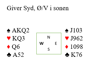 Det er lett å se med alle kort åpne at N/S kan ta fire ruterstikk og hjerter ess. Men husk, det ser ikke motparten!
