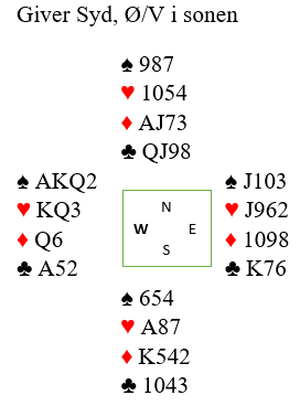 Hvis derimot spillefører er flinkere til "¨skjule korta sine" vinner han kløverutspillet og spiller hjerter med det samme. Syd vinner med esset, men nå vet han ikke noe om de ni poengene den skjulte hånden (vest) har i spar! I den situasjonen kan godt fortsettelse i kløver være riktig fra syd. Kanskje finner han ruterskiftet, men da har i alle falle gjort alt du kan for at han ikke skal finne det! Og gjør han ikke det og hjerterfargen som her viser seg å gi tre stikk har du dine ni stikk (4+3+0+2).
