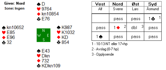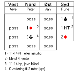 Jeg kan tenke meg at Arve syntes sparfarga var for tynn til å gå inn med 1 spar mot en passet makker, særlig tatt i betraktning at han hadde bare 9 hp også. Men det skulle vise seg at det ikke ble så enkelt å komme med i det hele tatt da han valgte å passe første gang. Det er jo ikke spesielt fristende å gå inn på 2-trinnet i andre melderunde. Nord har riktignok forhåndspasset, men kan jo likevel ha så mye som 10-11 hp. Egentlig er det scenarioet fortsatt mulig i tredje melderunde. 2 kløver fra nord kan jo innebære ei invitthånd av noe slag, men aktuelt var det altså ei svak hånd og ønske om å spille 2 ruter i stedet for 1 grand som var bakgrunnen for 2 kløver.