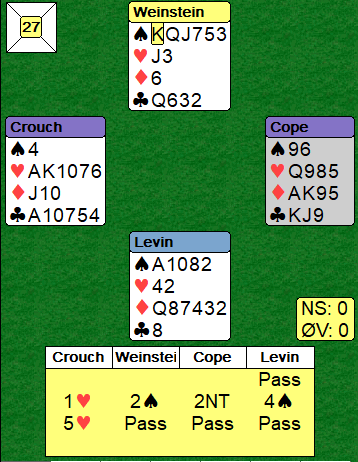 Ved det andre bordet meldte Mikkelsen pass over 5 ruter og da endte det med at Syd meldte 5 spar som ble sluttkontrakt. Hele spillet var slik: