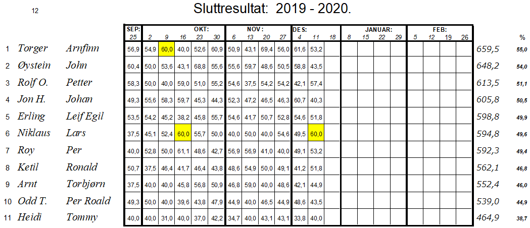 Halvard og Hallgeir stakk av med seieren i kveld, gratulerer. Sammenlagt ble det svært jevnt, men Svein og John Ivar dro i land seieren, som vanlig.
