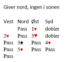 Da syd doblet og doblet igjen før han meldte ruter måtte han ha en monsterhånd. Jeg var ikke sikker på at det var riktig å løfte til 5 ruter, men trekorts trumf og en dobbelton var fine verdier selv om 3HP (hjerter konge) er bortkastet.