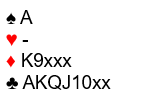 Ved bordet tok spilleren med disse kortene en ikke urimelig sats da han hoppet rett i 7 ruter. Da nestemann (Jomar Lygre Undheim) doblet innså storeslemmelderen at han nok hadde satset feil. Og det var da også skivebom da makkeren hadde åpnet med dette: