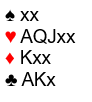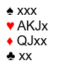 Makker har trolig noe bra i åpningsfargen, for han har sannsynligvis ikke noen poeng i spar. Men det kan jo hende han sitter med mange poeng i hjerter slik at ruterfargen er tynn. Det er kanskje en mulighet å melde 4 spar som sleminvitt først. Det vil neppe føre til noe særlig da makker aldri kan se for seg hva du sitter med.