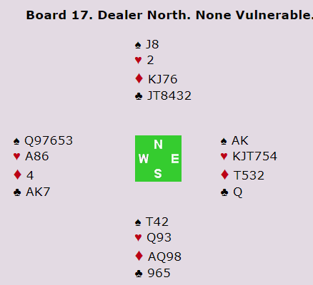 Her er et spill mot slutten av GUPTA sin kamp, og det viser hvordan det ofte går når man er i ferd med å bli knust. Da tapes spill som like gjerne kunne gått andre veien, men i teorien meldte vel det russiske Ø/V-paret feil? (Nord giver, ingen i sonen)