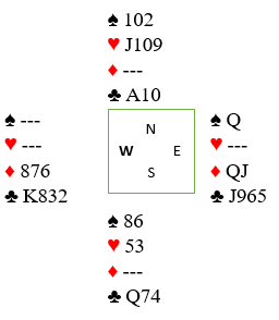 Spillet har gått som beskrevet, og øst spilles inn på spar dame. Spiller han da ruter er det greit, syd trumfer og fra nord forsvinner kløver 10. Så øst bør selvsagt spille liten kløver. Da har spillefører valget. Han kan legge liten fra syd som med denne sitsen fører til at vest må på med kongen. Men om øst og vest bytter kløverhonnør og det legges liten fra syd kommer i så fall knekten fra vest, og det tapes ett stikk mens det med slik kløversits ville blitt riktig å hoppe opp med kongen idet øst spiller kløver.