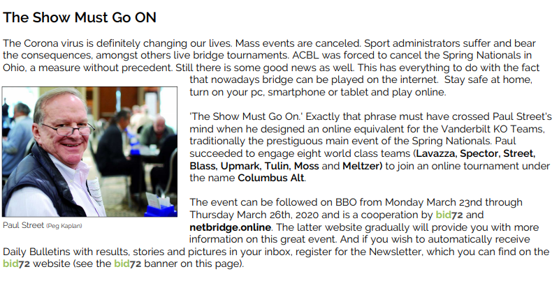 Omtrent nå skulle det amerkanske vårmesterskapet (Spring Nationals) ha blitt arrangert i Columbus, Ohio. Det ble som alt annet av store arrangement avlyst. Da kom det raskt opp en idé om å lage en lagturnering for topp-lag på BBO. Den kalles Colubus Alt, og det spilles nå, i skrivende stund. Det deltar åtte, sterke internasjonale lag, og etter første dag leder velkjente LAVAZZA (Italia).