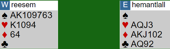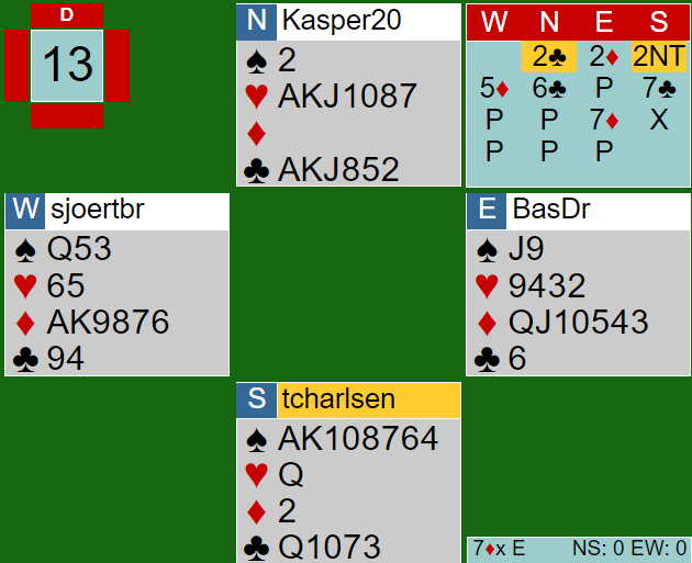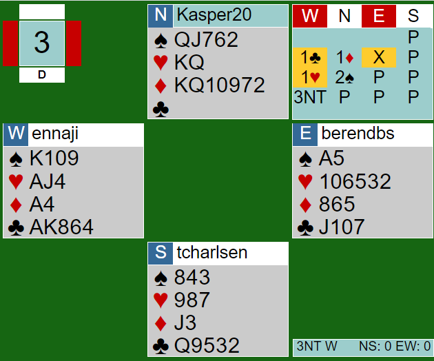 Nå ble det spilt kløver for nord, og fra syd forsvant ruter 9. Vest vant med kløver knekt og kunne ta ett stikk i ruter, men så måtte han spille hjerter som ga syd for hjerter konge, det niende stikket.