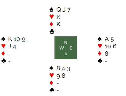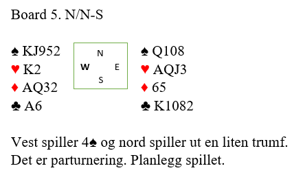 Spillefører stakk med spar konge i andre stikk og spilte hjerter til nieren fra nord, damen og esset. Derfra kom spar som nord trumfet med hjerter 10. Nord spilte deretter liten kløver. Jeg kan røpe at kontrakten nå står om hjertersitsen tippes.