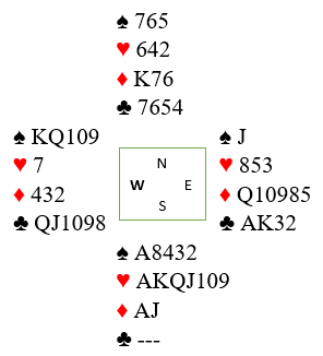 Etter kløver ut til stjeling og tre runder trumf (syd har kun to trumf nå) spilles spar ess og mer spar. Vest vinner og spiller mer kløver som syd trumfer og har da kun en trumf igjen! Hvis sparfargen satt 3-2 ville det vært greit, ett sparstikk til ville blitt gitt bort og syds hånd ville vært godspilt, elleve stikk som alle andre.