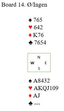 Her er det flere veier hjem til rom. Én som jeg tror vil fungere godt er denne: Du vinner tredje stikket med hjerter-ess og prøver sparkutten. Når denne går spiller du deg hjem på ruter-ess og tar enda en finesse. Når denne også står er det på tide å putte inn vest! Spill spar-knekt, og nå er vest ferdig. Han kan få et stikk nå, eller vente med det til det passer ham: Ett sparstikk er alt han vil få.