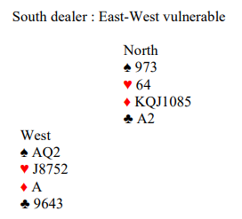 Altså har ikke øst noen hjerterhonnør. Siden du vet at spillefører har AKQ i hjerter vet du også at han har minst ni stikk så snart han kommer inn med tre stikk i hjerter, fem ruterstikk og kløver ess. Det går altså ikke å bete denne utgangen med å spille mer hjerter eller skifte til kløver. Eneste betesjanse er i spar, og det skal ikke mer til enn at makker har kongen fjerde.
