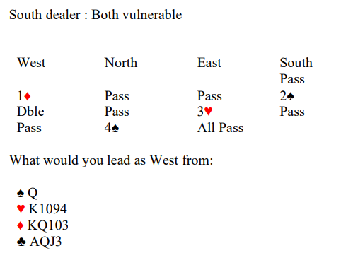 Det er minimum, men jeg ville nok åpnet med 1 kløver med så god farge. Det har imidlertid ikke så mye med saken å gjøre. En av de «skyldige» sa 1 kløver, og vest hoppet inn med 2 hjerter (svakt innhopp). Nord sa 2 spar (10+hp, minst fem spar). Etter pass fra øst sa syd 3 kløver, og makkeren meldte 3 ruter før øst også kom med i meldingene med 3 hjerter. Nå passet syd, og så langt er vel alt helt normalt. Nord kom så tilbake med 4 ruter. Det kan kanskje være litt delte meninger om det er krav? Kanskje kan nord ha bare en fin fordelingshånd og 10-12 poeng? Vel, du må vel melde selv om situasjonen ikke er helt avtalt i ditt makkerpar. Og selv med helt minimums åpning har du tross en honnør i hver av makkerens farger, ikke så galt. La oss si du ikke tør si pass. Hva melder du da?