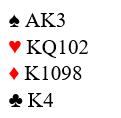 Han (eller hun) med disse gode kortene åpnet med 1 ruter og makkeren svarte 1 hjerter. Hva ville du meldt nå?