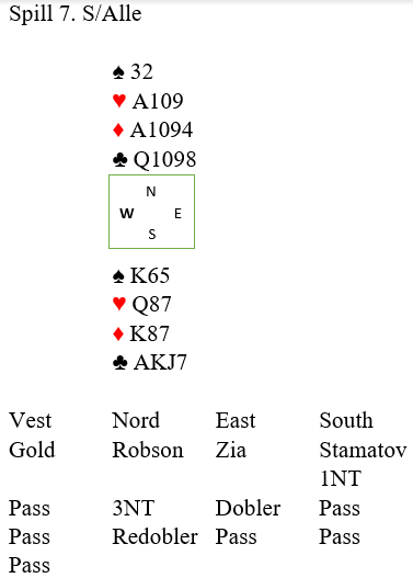 Siden spar satt 5-2 med damen femte hos syd kan ikke ekstra sparstikk godspilles og det blir en taper i hjerter i tillegg til trumftaperen. Livgård vant likevel slemmen da syd uforståelig kastet ruter dame idet spillefører ga bort trumfstikket til nord. Det unødvendige påkastet ser mest ut som en BBO-feil(?), kanskje et såkalt "miss-click"? Da nord kom inn på kløver dame måtte han nemlig spille unna ruter knekt opp i vests A-10, eller spille fra hjerter konge som ble hva han gjorde, og da ga hjerter dame stikk! Det var vel ikke helt ufortjent å notere slem siden det var en god kontrakt, men likevel et heldig gevinstspill som kunne fått motsatt fortegn.