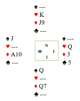Her kunne det altså vært slik at syd satt med både spar dame og hjerter konge. I så fall må det en enkel skvis til mot han. For at den skal fungere må hjerter ess få ligge der borte og hjerteren gi overgang i sluttposisjonen. Ruterstikkene må tas for å få innkassert nok stikk slik at syd blir presset til gi opp ett av holdene. Om det spilles på det, og det sitter slik, vil sluttposposisjonen bli slik (altså forutsatt at syd har hjerter konge):