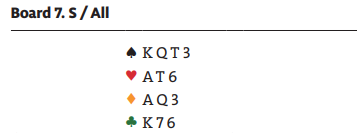 Hvis syd spiller ut liten spar er det ikke så enkelt for N/S å finne motspillet. Da må nord elegant legge liten i første stikk slik at N/S beholder overgang til sparstikkene med esset og en til idet syd er inne på kløver ess. Det er lett å si at det er riktig å la spillefører vinne første stikk etter liten spar ut fra syd når man ser alle kortene. Men nord vet ikke at syd har kløver ess, og å legge liten kan bli veldig galt om syd har spilt ut fra for eksempel A-J fjerde. Legges liten spar fra nord i første stikk - som altså er helt nødvendig her - kan det det godt hende spillefører etter å ha fått forært stikket for sin dame dobbel rasker sammen ni stikk mens forsvaret kunne tatt fem sparstikk med det samme.