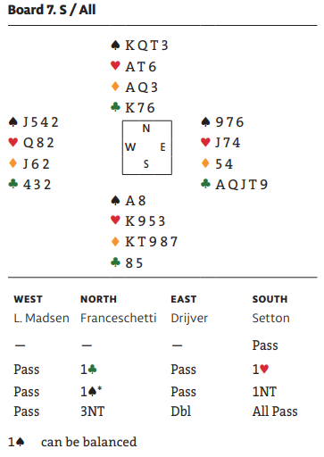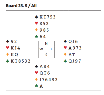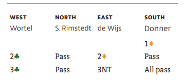 Sandra Rimstedt (nord) la styrke på spar ess, og da spar 8 kom fra syd i andre stikk overlot den svenske damen stikket til øst. Det er helt nødvendig, for nord er jo helt uten inntak. Spillefører måtte angripe kløveren og håpe sparfargen satt fordelt 4-4 selv om alt tydet på at det ikke var tilfelle. Syd vant med kløver ess, og da han hadde en gylden sparfirer å spille som overgang til nord fikk forsvaret fatt i fire sparstikk i alt som sammen med kløver ess ga beten.