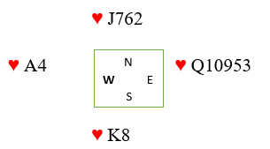 Hvis hjerteren sitter 3-3 og de har hver sin honnør er det 50-50 hvis du ikke har noen informasjon. Det kan like godt være riktig å spille på kongen hos nord (forlange damen fra øst) som knekten (ta finessen). Så la oss se bort fra 3-3 sitsene hvor det er hipp som happ. Hva om det sitter 4-2?