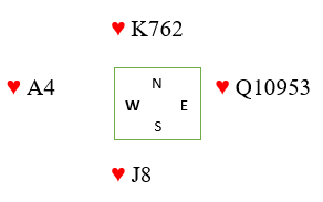 La oss si du etter esset og liten mot øst legger tieren og nord har fire hjerter. Hvis tieren da drar kongen så det slik ut fra start: