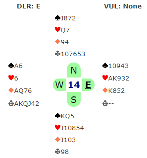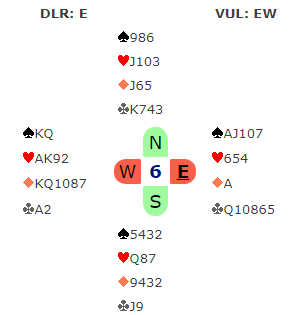 Ved det andre bordet havnet Ø/V i 6 kløver. Der var det ingen tapere utenom trumffargen, men den var jo nokså usikker. Spillefører tok for kløver ess og noterte at nieren falt fra syd. Så liten kløver mot øst og...damen! Idet knekten falt var det bare å presse ut kløver konge, +1370 og 2 IMP til De BOTTON.