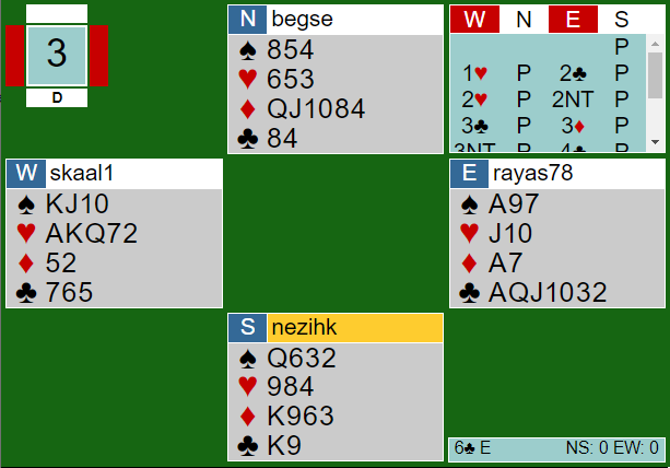 Brogeland (syd) var i 4 spar. Han fikk ikke noe skarpt motspill mot seg da vest tok to hjerterstikk før han skiftet til kløver 6, og øst satte i kongen. Da spilte nordmannen simpelthen spar til esset og spar dame, og forsvaret kunne ikke få for mer enn trumfkongen, N/S + 620.