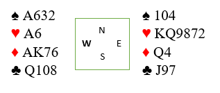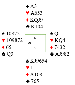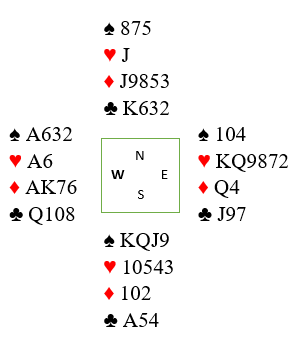 Hvis trumfen sitter 3-2 i denne 4 hjerterkontrakten er det et hverdagsspill. Etter å ha tatt ut motpartens trumf gir tre runder ruter avkast for en spar, og spillefører vil deretter tape kun til A-K i kløver, elleve stikk.