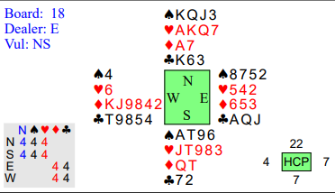 Merk at i 4 spar på 4-4 tilpasningen fremfor å spille på trumftipasningen 5-4 i hjerter er det visse sjanser for tolv stikk om en ser kun N/S sine kort, men det må sitte veldig snilt. Hvis spar (som trumf) sitter 3-2 og kløver ess er plassert foran kongen er forskjellen fra hjerterkontrakt at i sparkontrakt kan sidefargen hjerter gi et avkast for en ruter hos nord. Men siden spar som da er trumf altså satt 4-1, og kløver ess satt bak kongen var det ikke mulig å få mer enn ti stikk i verken spar eller hjerterkontrakt.