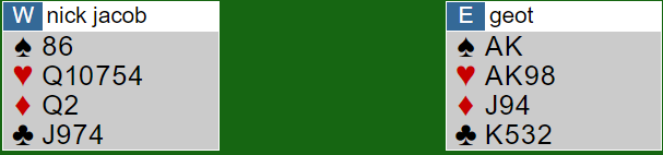 Vest (Nick) var i 4 hjerter etter at syd hadde hoppet inn med en svak 2 spar over min 1 kløver, og N/S hadde vært med til 3 spar.
