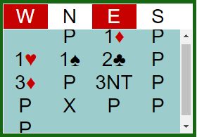Over reversen 2 ruter krevde Jessica med 2 spar, og over 2 grand fra øst viste hun ruterstøtten. Geir avsluttet med 3 grand. Nord turde ikke doble etter disse meldingene som tydet på at Ø/V var veldig sterke. Syd hadde ingen spesiell grunn til å spille ut noe annet enn makkers farge, spar.