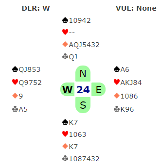 Det siste avsnittet er ikke riktig. Slemmen (6H) er langt i fra så dårlig som jeg hevdet. Innlegget ble antagelig skrevet uten å "huske" at vest hadde spar knekt. Siden han har det kortet er 6 hjerter i praksis avhengig av at nord har spar konge. Hvis vest hadde hatt spar konge i stedet for Q-J ville slemmen vært glimrende med samme antall HP hos Ø/V tilsammen.
