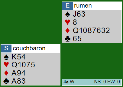 Dag Amund Lie (Ø) åpnet med 1 kløver og Tom (S) gikk innpå med 1 spar. Øyvind Bronken (V) meldte 1 spar og Lars (N) 2 ruter. Deretter kom 2 hj fra Ø, 3 ru fra S og 4 hj fra V. Men Helgesen var i stampehumør og meldte 5 ruter og Øst hadde et vanskelig valg, doble eller melde over? 5 hjerter ble valgt og nå doblet Gjøs! Da var kontrakten satt. Ru Aog ny ruter kunne betet kontrakten for som det sitter kan ikke Øst komme inn på bordet som ville gjort at trumfen med rett valg kan spilles med bare en taper. I stedet fant Tom fram et annet utspill- hva var det tror du?