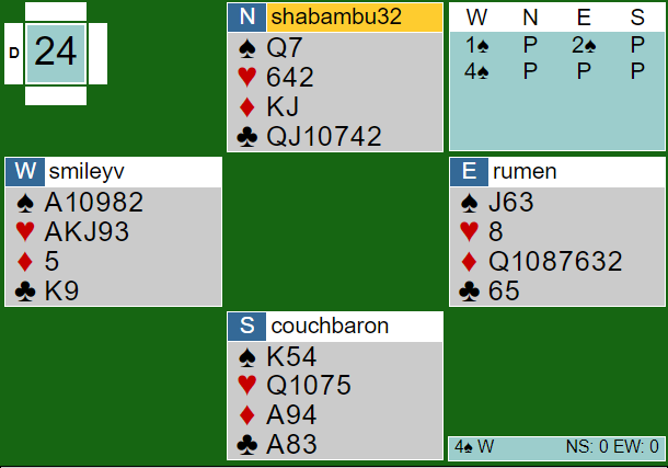 Utspillet var det samme ved det andre bordet. Men i stedet for direkte å spille på sparen prøvde spillefører å snike til seg et stikk i kløver med 6-eren, men Lasse Aaseng i Vest var våken og stakk med 10-eren for så å kontre med ruter dame! Spilleren stakk hjemme og spilte ny kløver men Lasse stakk påny og fortsatte med ruter til bordet. Det ble prøvd med hjerter knekt, men den fikk beholde stikket og da var det ingen vei igjen til 9 stikk. Bordet blir jo innspilt. Med 700 inn på spillet trygget det seieren som var klar nok selv med to-tre leie tapsspill.