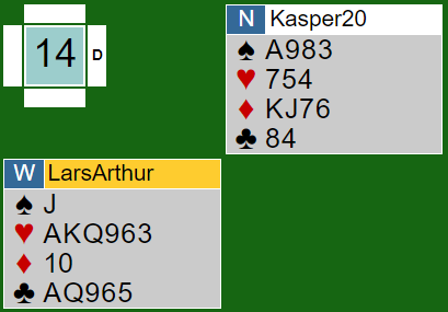 Merk den enorme dobbeltilpasningen (begge sider har tilpasning i to farger) det er i dette spillet. Det er ti enkle stikk i spar N/S, og Ø/V har elleve stikk i hjerter!