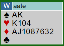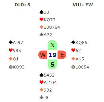 Det kan se ut som et valg i ruter. Syd kan jo ha enten ha ruter dame, eller esset. Men det er en slags illusjon å tenke på det, for om nord har ruter ess går det jo galt uansett siden han kommer inn og tar to hjerterstikk. Derfor må du si "sus opp", og idet kongen blir lagt fra vest vinner den stikket! Da er det raskt en fet utgangsnotering på listen.