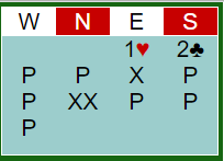Selv +800 for tre bet ville vært alt for lite da meldingene ved det andre bordet gikk slik at syd ble spillende 2 kløver redoblet!