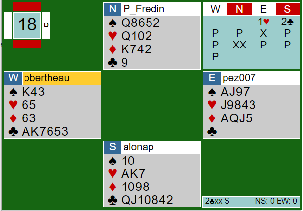 I vest sin 3 kløver ble det tre bet, +150. For Lag DE BOTTON var spillet verd 15 IMP siden syd ved det andre bordet meldte inn, og en ikke så veldig heldig redningsaksjon (men heldigere enn Fredin sin) kostet -1100 i 2 ruter doblet.