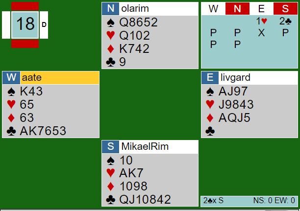 Mikal Rimstedt mente det og meldte altså inn 2 kløver. Det gikk to passer før Livgård gjenåpnet med en opplysende dobling som Aa gjorde om til straffedobling ved å passe.