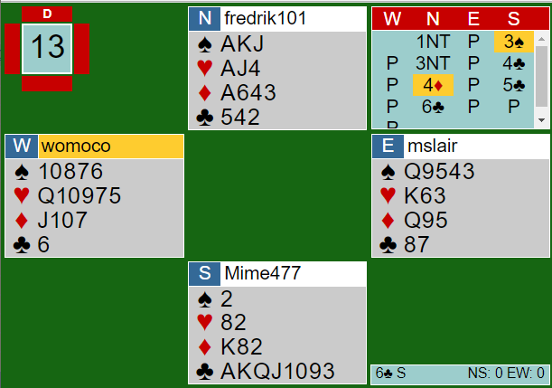 Det er imidlertid litt tilfeldig at det ble galt denne gangen som var fordi 3 grand spilt av syd var veldig vanskelig å vinne etter ruterutspill fra vest. Da det ble en bet ved det bordet vant lag TURBO 12 IMP.